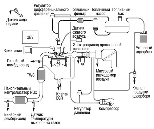 Подсистема очистки и нейтрализации выхлопных газов. Система очистки выхлопных газов состоит из трехкомпонентного каталитического нейтрализатора, расположенного близко к двигателю, и подпольного NOx-адсорбера. Контроль состава смеси в обедненном режиме, включая фазы регенерации, осуществляется с помощью широкополосного датчика кислорода (лямбда-зонда). Датчик температуры выхлопных газов оптимизирует работу накопительного катализатора и инициирует меры по его защите. Для корректной работы фазы регенерации после катализатора устанавливается бинарный лямбда-зонд или специализированный датчик NOx.