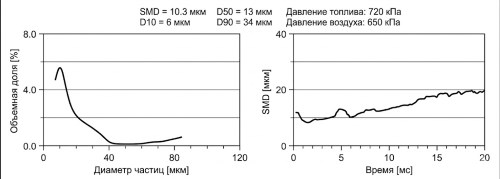 В воздушном инжекторе поддерживается уровень давления, при котором превышается критическое соотношение давлений на отверстии клапана. Возникающая при этом звуковая скорость воздушного потока создает мощные аэродинамические силы, воздействующие на топливную струю. Основная часть процесса атомизации (распыления) завершается непосредственно на выходе из клапана. Средний диаметр капель по Заутеру (SMD) составляет всего 10.3 мкм, а количество капель диаметром более 40 мкм незначительно.