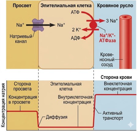 Регуляция эпителиального транспорта имеет критическое значение, поскольку этот процесс не является статичным, а высоко регулируется гормонами, нейромедиаторами и местными факторами. Например, альдостерон увеличивает количество Na⁺-каналов и Na⁺/K⁺-АТФаз в эпителиальных клетках почек, усиливая реабсорбцию натрия. Антидиуретический гормон (АДГ) регулирует водопроницаемость, встраивая аквапориновые каналы в апикальную мембрану клеток собирательных протоков. Такие регуляторные механизмы обеспечивают адаптацию эпителиальных тканей к изменяющимся физиологическим условиям, поддерживая гомеостаз жидкостей и электролитов во всём организме. Нарушения этих механизмов лежат в основе многих заболеваний, включая муковисцидоз (дефект хлоридных каналов), артериальную гипертензию (избыточная реабсорбция Na⁺) и диарею (нарушение всасывания воды в кишечнике). Понимание эпителиального транспорта открывает перспективы для разработки лекарственных препаратов, воздействующих на ионные каналы и транспортеры.