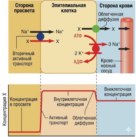 Рисунок 4.24 иллюстрирует активное всасывание органических молекул через эпителий по трансклеточному пути. В этом случае проникновение органической молекулы (обозначенной X) через апикальную мембрану осуществляется с помощью вторичного активного транспортера, сопряжённого с нисходящим движением Na⁺ в клетку. Молекула X перемещается из просветной жидкости с низкой концентрацией внутрь клетки, где её концентрация становится высокой, за счёт энергии, запасённой в электрохимическом градиенте Na⁺. Затем вещество выходит через базолатеральную мембрану путём облегчённой диффузии — от более высокой внутриклеточной концентрации к более низкой внеклеточной концентрации на стороне крови. В результате концентрация вещества в крови может значительно превышать таковую в просвете, приближаясь к равновесию с высоким внутриклеточным уровнем, созданным на этапе аппкального входа.