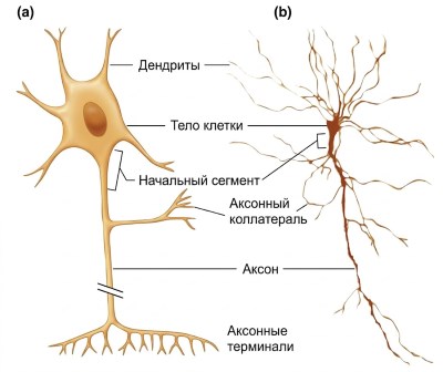 Нейроны отличаются поразительным разнообразием по размеру и форме, однако все они обладают общими свойствами, обеспечивающими межклеточную коммуникацию. Длинные отростки, называемые процессами, соединяют нейроны друг с другом и выполняют функции ввода и вывода сигналов. Как показано на рисунке 6.1, большинство нейронов содержат клеточное тело (сому), а также два типа отростков: дендриты и аксоны. Данные структурные компоненты являются фундаментальными для передачи сигналов и интеграции в нервной системе.