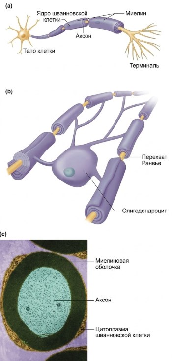 Многие аксоны покрыты миелиновой оболочкой (рис. 6.2), обычно состоящей из 20–200 слоёв сильно модифицированной плазматической мембраны, обёрнутой вокруг аксона близлежащей поддерживающей клеткой. В головном и спинном мозге эти миелинообразующие клетки относятся к типу глиальных клеток, известных как олигодендроциты. Один олигодендроцит может ветвиться, образуя миелин на целых 40 аксонах. В периферической нервной системе (ПНС) шванновские клетки формируют отдельные миелиновые оболочки, окружающие сегменты длиной 1–1,5 мм, расположенные через равные промежутки вдоль некоторых аксонов. Промежутки между соседними участками миелина, где плазматическая мембрана аксона контактирует с внеклеточной жидкостью, называются узлами Ранвье. Миелиновая оболочка ускоряет передачу электрических сигналов по аксону и сохраняет энергию.