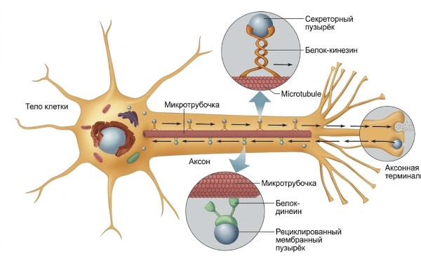 Для поддержания структуры и функционирования аксонов различные органеллы и материалы должны перемещаться на расстояние до одного метра между телом клетки и окончаниями аксонов. Это движение, называемое аксональным транспортом, основано на системе микротрубочек — «рельсов», проходящих по всей длине аксона, и специализированных моторных белках — кинезинах и динеинах (рис. 6.3). Эти двуглавые моторные белки связывают клеточный груз с одного конца и используют энергию гидролиза АТФ для «передвижения» по микротрубочкам. Кинезин преимущественно обеспечивает транспорт от тела клетки к окончаниям аксонов (антероградное движение), доставляя молекулы питательных веществ, ферменты, митохондрии, везикулы с нейромедиаторами и другие органеллы. Динеин движется в противоположном направлении (ретроградно), перенося переработанные мембранные везикулы, факторы роста и химические сигналы, влияющие на морфологию, биохимию и связность нейронов. Ретроградный перенос также служит путём, по которому вредные агенты (токсин столбняка, вирус простого герпеса, вирус бешенства и полиовирус) проникают в ЦНС.