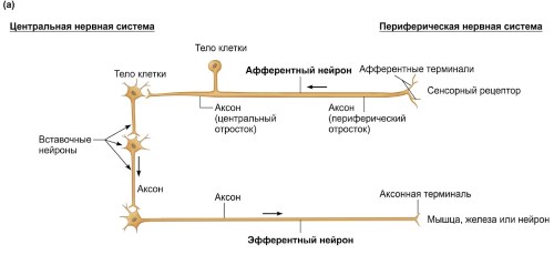 На своих периферических концах (наиболеe удалённых от ЦНС) афферентные нейроны обладают сенсорными рецепторами, которые реагируют на физические или химические изменения в окружающей среде, генерируя электрические сигналы. Рецепторная область может быть специализированным участком плазматической мембраны или отдельной клеткой, тесно связанной с окончанием нейрона. (Следует различать два значения термина «рецептор»: сенсорный рецептор, определённый здесь, и специфические белки, с которыми взаимодействуют химические посредники для воздействия на клетки-мишени.) Афферентные нейроны проводят электрические сигналы от своих рецепторов в головной или спинной мозг.