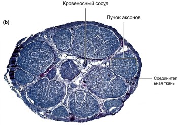 Рисунок 6.4. (а) Три класса нейронов. Стрелки указывают направление передачи нейронной активности. Афферентные нейроны в ПНС обычно получают информацию от сенсорных рецепторов (в некоторых случаях сами афферентные терминальные ответвления модифицируются в сенсорные рецепторы). Эфферентные компоненты ПНС могут заканчиваться в мышцах, железах, нейронах или других эффекторных клетках. Как афферентный, так и эфферентный компоненты могут состоять из двух нейронов, а не из одного, как показано здесь. (б) Поперечный разрез нерва, видимый на световой микрофотографии (увеличение приблизительно в 50 раз). Нерв — это совокупность нейронных аксонов, заключённых в соединительную ткань и расположенных в периферической нервной системе.
