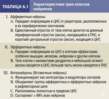 Интернейроны находятся исключительно в Центральной нервной системе. Они составляют более 99% всех нейронов и обладают широким спектром физиологических свойств, форм и функций. Количество интернейронов, расположенных между определёнными афферентными и эфферентными нейронами, варьируется в зависимости от сложности контролируемого действия. Например, коленный рефлекс, вызываемый постукиванием ниже коленной чашечки, активирует мышцы бедра практически без участия интернейронов — большинство афферентных нейронов взаимодействуют непосредственно с эфферентными нейронами. Напротив, при прослушивании песни или вдыхании аромата духов, вызывающих воспоминания, могут задействоваться миллионы интернейронов. В таблице 6.1 приведены характеристики трёх функциональных классов нейронов.