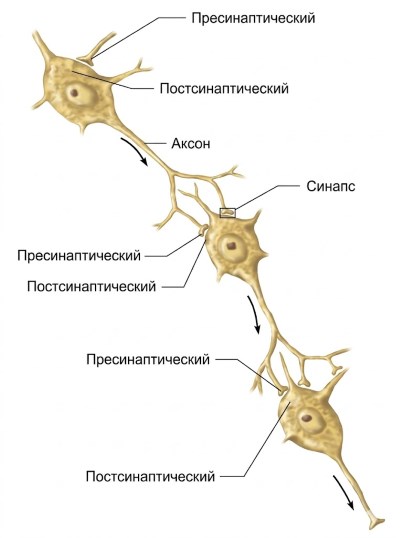 Синапсы и поток информации. Анатомически специализированное соединение между двумя нейронами, в котором один нейрон изменяет электрическую и химическую активность другого, называется синапсом. В большинстве синапсов сигналы передаются от одного нейрона к другому с помощью нейромедиаторов — термин также включает химические вещества, используемые эфферентными нейронами для связи с эффекторными клетками (например, мышечными). Нейромедиаторы, высвобождаемые из пресинаптического нейрона, связываются со специфическими белковыми рецепторами на мембране принимающего нейрона (вновь не следует путать это значение термина «рецептор» с сенсорными рецепторами на периферических окончаниях афферентных нейронов).