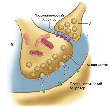Высвобождение нейромедиаторов некоторыми пресинаптическими окончаниями также изменяется в результате активации мембранных рецепторов на самих этих окончаниях. Активация пресинаптических рецепторов влияет на приток Ca²⁺ и, соответственно, на количество синаптических везикул, высвобождающих нейромедиатор в щель. Эти пресинаптические рецепторы могут быть частью второго синаптического окончания, образуя аксоаксонический синапс, где терминаль аксона одного нейрона заканчивается на терминали аксона другого. Например, на рисунке 6.33 нейромедиатор, выделяемый нейроном A, связывается с рецепторами на окончании B, изменяя количество медиатора, высвобождаемого из B в ответ на потенциалы действия. Таким образом, нейрон A не влияет напрямую на нейрон C, но оказывает пресинаптическое воздействие на синапсы B-C, либо уменьшая высвобождение (пресинаптическое торможение), либо усиливая его (пресинаптическое облегчение).