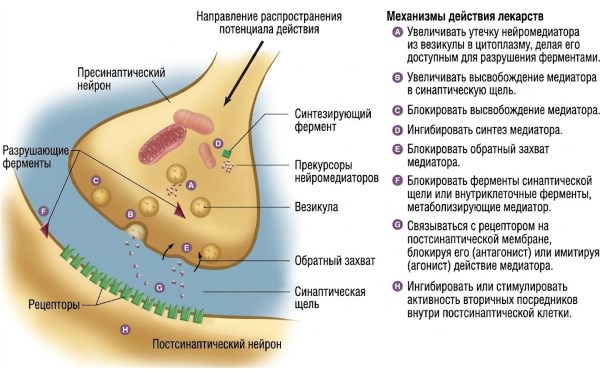 Рисунок 6.34. Схема химического синапса с указанием основных мишеней действия лекарственных средств: синтез нейромедиатора, упаковка в везикулы, высвобождение, связывание с постсинаптическими рецепторами, обратный захват и ферментативное разрушение.