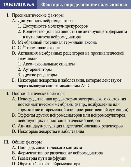 В таблице 6.5 обобщены многочисленные факторы, определяющие синаптическую силу, включая свойства пресинаптического высвобождения, типы рецепторов, модулирующие воздействия и патологические механизмы. В совокупности эти пресинаптические и постсинаптические вариации позволяют нервной системе динамично адаптироваться к изменяющимся условиям, но одновременно делают синапсы уязвимыми для фармакологических и патологических нарушений. Понимание этих механизмов открывает возможности для разработки новых лекарственных средств и терапевтических стратегий при неврологических и психических расстройствах.