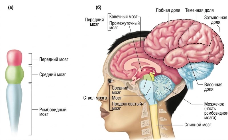 Рисунок 6.38. Структуры головного мозга человека. (а) Развитие трёх основных отделов головного мозга у 4-недельного эмбриона. (б) Основные отделы мозга взрослого человека, показанные в сагиттальном разрезе. Внешняя поверхность коры головного мозга разделена на четыре доли.