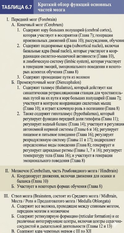 Мост, продолговатый мозг и средний мозг тесно взаимосвязаны, выполняют схожие функции и благодаря анатомическому расположению рассматриваются вместе как ствол головного мозга. Мозг также содержит четыре взаимосвязанные полости — мозговые желудочки, заполненные жидкостью и обеспечивающие физическую поддержку. Обзор подразделений мозга представлен в таблице 6.7, а детальное описание функций приведено в главах 7, 8 и 10.
