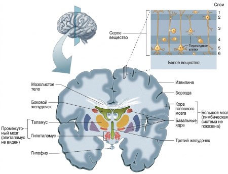 Рисунок 6.39. Фронтальный разрез полушарий головного мозга, показывающий части головного мозга и нижележащий промежуточный мозг (таламус и гипоталамус; эпиталамус не виден). Лимбическая система показана на рисунке 6.40. Мозолистое тело соединяет два полушария, образующие извилины и борозды. Также показаны некоторые из заполненных жидкостью желудочков и гипофиз. На вставке — упрощённое изображение шестислойной структуры коры.