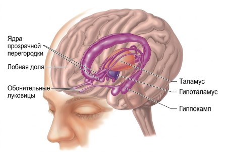 Рисунок 6.40. На частично прозрачном изображении мозга показаны основные структуры лимбической системы (выделены фиолетовым) и их анатомическая связь с гипоталамусом.