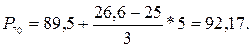 Покажем теперь применение формулы (3.1) на примере определения Р70 по данным таблицы 3.1. Оценка x*n = 0,70*38 = 26,6-я оценка – лежит в интервале 90-94, который имеет фактическую нижнюю границу 89,5. Разность между x*n и накопленной к 89,5 частотой составляет 26,6 – 25. Учитывая, что частота в интервале, включающем 26,6-ю оценку, равна 3, а ширина интервала равна 5, получаем