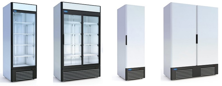 Холодильные шкафы предназначены для хранения охлаждённых (замороженных) продуктов, напитков. Различаются размерами, объёмом, количеством полок, наличием принудительного конвективного охлаждения внутреннего объёма. Шкаф может иметь распашные или раздвижные двери. Может оснащаться блоком управления с режимом автооттайки.