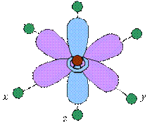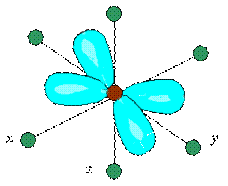 Інші три d-АО – d(xy), d(xz) і d(yz), розташовані між осями координат і між лігандами, знаходяться на значнішій відстані від них. Взаємодія таких D-АО з лігандами мінімальна, а отже – енергія d(xy), d(xz) і d(yz) -АО знижується в порівнянні з початковою.