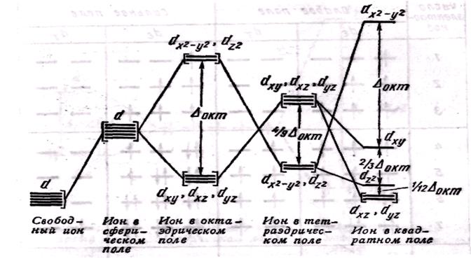 Розглянемо випадок октаедричного розташування лігандів (наприклад, [CoF6]3- або [Co(NH3)6]3+). В центрі октаедра знаходиться атом-комплексоутворювач М(+n) з електронами на d-атомных орбіталях, а в його вершинах – ліганди у вигляді точкових негативних зарядів (наприклад, іони F- або полярні молекули типу NH3). В умовному іоні М(+n), не пов'язаному з лігандами, енергії всіх п'яти d-АОоднакові (тобто атомні орбіталі вироджені).