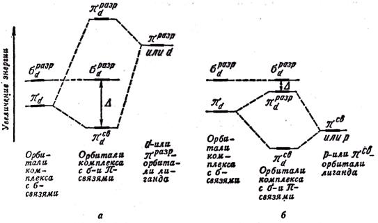Якщо ж в π-взаємодії беруть участь орбіталі лігандів, енергетично нижчі, ніж d-орбіталі, то D стає менше величини, характерної для комплексів з одними лише σ- зв’язками (мал., б). Подібний випадок характерний за участю зайнятих електронами р- або πсв-орбиталей лігандів. При утворенні πразр обиталей комплексу деяка частина електронної щільності від лігандів переноситься до центрального атома