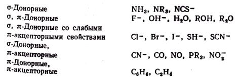 Ліганди, що є π-акцепторами, характеризуються великим Δ (викликають велике розщеплювання d-рівня); ліганди, що є π-донорами, навпаки, характеризуються малими Δ (викликають мале розщеплювання d-рівня). По характеру σ- і π-взаємодії ліганди можна підрозділити на наступні групи: