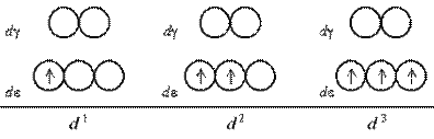 Розглянемо розподіл електронів по de- і dg-орбиталям в октаедричному полі лігандів. Заселення de- і dg-орбиталей відбувається в повній відповідності з правилом Гунда і принципом Паулі. При цьому незалежно від значення параметра розщеплювання перші три електрони займають квантові осередки de-подуровня: