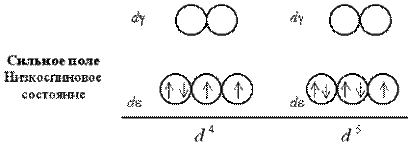 Якщо число електронів на d-подрівнікомплексоутворювача більше трьох, для розміщення їх по розщеплених підрівнях з'являється дві можливості. При низькому значенні параметра розщеплювання (слабке поле лігандів) електрони долають енергетичний бар'єр, розділяючий de- і dg-орбітали; четвертий, а потім і п'ятий електрони заселяють квантові осередки dg-підрівня. При сильному полі лігандів і високому значенні D0 заселення четвертим і п'ятим електроном dg-підрівнявиключено; відбувається заповнення de-орбиталей.