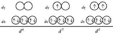 Шостий, сьомий і восьмий електрони у разі слабкого поля виявляються знову на de-підрівні, доповнюючи конфігурації до електронних пар (одній у разі d6, два – d7і три – d8):