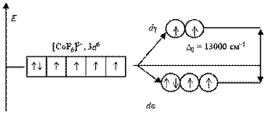 У аніоні [CoF6]3- ліганди F- створюють слабке кристалічне поле (D 0 = 13000 см-1), і всі електрони початкової 3d6-АО розміщуються на de- і dg-орбиталяхбез якого-небудь спаровування. Комплексний іон є високоспіновим і містить чотири неспарені електрони, тому він парамагнитний.