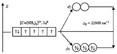 У іоні [Co(NH3)6]3+ ліганди NH3 створюють сильне кристалічне поле (D0 = 22900 см-1), всі 3d6-электроны розміщуються на більш енергетично вигіднії de-орбіталі. Перехід електронів з de- на dg-орбіталінеможливий з-за дуже високого енергетичного бар'єру. Тому даний комплексний катіон є низькоспіновим, він не містить неспарених електронів і діамагнитний.
