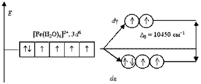 Ліганди H2O створюють слабке поле; обмін електронами між de- і dg-орбіталями не викликає ускладнень і тому число неспарених електронів в комплексному іоні таке ж, як і в умовному іоні Fe+II. Отримуваний аквакомплекс – високоспіновий, парамагнітний. Навпаки, ліганди CN- викликають значне розщеплювання d-АО, що становить 33000 см-1. Це означає, що існує сильна тенденція до розміщення всіх електронів на de-орбіталях.Виграш енергії, що отримується при такому заселенні орбіталей, багато більше енергетичних витрат, обумовлених спаровуванням електронів.