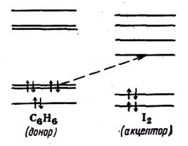 Рис. Схема перенесення заряду в комплексі йоду з бензолом (пунктиром показані рівні, між якими відбувається перенос заряду).