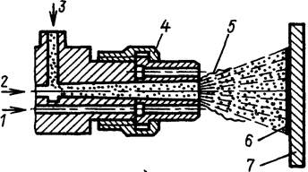 Рис. 21.1. Газоплазменная горелка для напыления порошка: 1 – рабочий газ; 2 – транспортный газ; 3 – порошок; 4 – сопло; 5 – факел пламени; 6 – покрытие; 7 – деталь