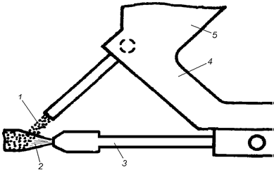 Рис. 21.2. Пистолет для наплавки порошка ацетилено-кислородной горелкой: 1 – порошок; 2 – пламя; 3 – газовая горелка; 4 – рукоятка; 5 – бункер для порошка