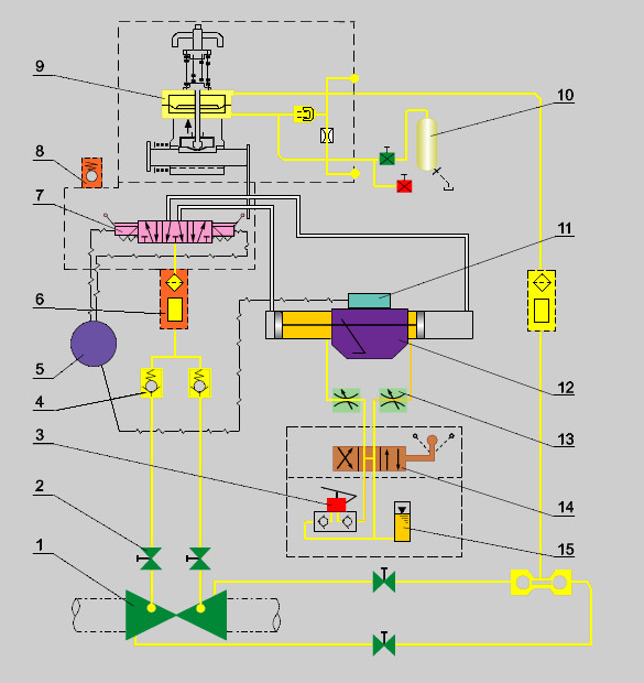На рисунке обозначены:1 – шаровый кран; 2 – запорный кран; 3 – ручной насос; 4 – обратный клапан; 5 – клеммная коробка; 6 – блок фильтров; 7 – соленоидный клапан; 8 – предохранительный клапан; 9 – отсекающее устройство; 10 – контрольный бак; 11 – конечный выключатель; 12 – привод; 13 – дроссель; 14 – распределительный кран; 15 – бак.