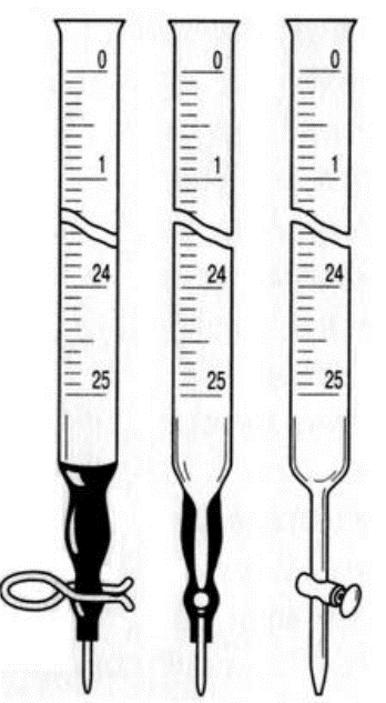 Есть разновидности бюреток, в которых затвором служит зажим Мора или стеклянный кран (используется для титрования веществ, которые разрушают резину).