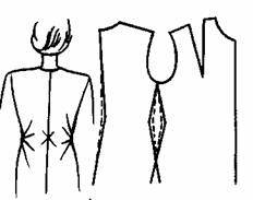 | Несоответствие размеров и формы деталей одежды фигуре на отдельных участках приводит к появлению продольных, косых и поперечных заломов и складок. Горизонтальные складки под воротником на спинке образуются при излишней удлиненности средней части спинки от линии горловины до линии проймы или слишком большой наклонности плечевых срезов. Недостаток устраняют увеличением глубины горловины и уменьшением скоса плечевых срезов спинки |