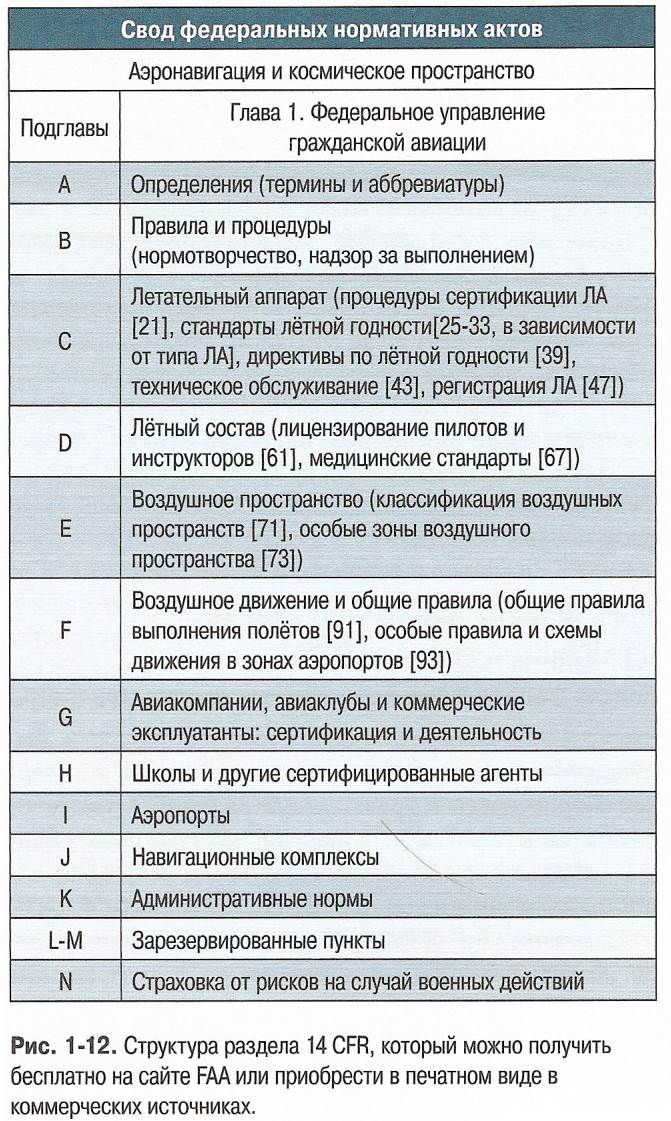 Глава 1 раздела 14 CFR, глава 1, «Федеральное управление гражданской авиации», разбита на подразделы A-N (рис. 1-12).
