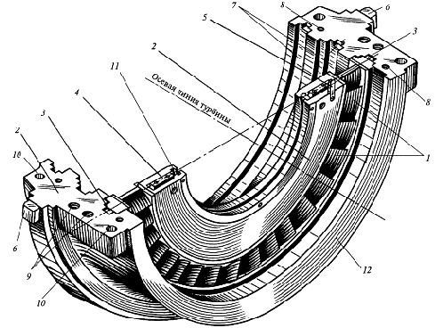 На рис. 4.9 представлена нижняя половина диафрагмы турбинной ступени с сопловой решеткой. Позициями 1 здесь показаны сопловые лопатки, позицией 2 - полотно диафрагмы, а 12 - нижняя часть обоймы, в которой установлена диафрагма. В обойме устанавливаются несколько диафрагм турбинных ступеней (на рисунке показаны пазы для установки трех диафрагм).