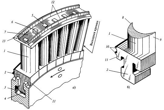 На рис. 4.10,а показан фрагмент рабочей решетки с лопатками 1, которые посредством Т-образного хвостовик 2 заводятся в паз 3 диска ротора. По периферийному диаметру все лопатки скрепляются бандажной лентой 7 посредством шипов 6. Выступы 12 на ленте образуют надбандажное уплотнение в рабочей решетке ступени. На рис. 4.11,б показана конструкция рабочей лопатки, состоящей из профиля 1 с входной 8 и выходной 9 кромками, хвостовика 2 с выступами 10 корневого уплотнения. Позицией 11 отмечены боковые замки хвостовика, не позволяющие рабочей лопатке при вращении выходить из паза 3 диска.