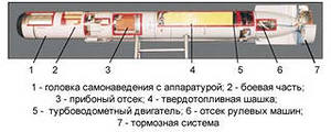 Поясним теперь особенности акустической головки самонаведения. У акустических приборов существенное значение имеет тот недостаток, что звук обладает малой скоростью распространения, особенно в атмосфере. Кроме того, создаваемые управляемым объектом звуковые помехи (например, шум двигателя и шумы обтекания) устраняются с большим трудом, а часто этого и вовсе нельзя добиться. Поэтому акустическая головка самонаведения предназначается для наведения на цель подводных торпед. В качестве чувствительных элементов головка имеет два магнитострикционных вибратора, которые устанавливаются в головной части торпеды. Напряжение низкой частоты, созданное в чувствительных элементах под воздействием исходящих от винта корабля-цели звуковых волн, усиливается и выпрямляется. Сигнал управления, полученный сравнением выходных величин отдельных каналов, воздействует непосредственно на управляющий орган (руль направления) торпеды. С его помощью торпеда наводится на цель по кривой погони с задней полусферы (следовательно, на винты).